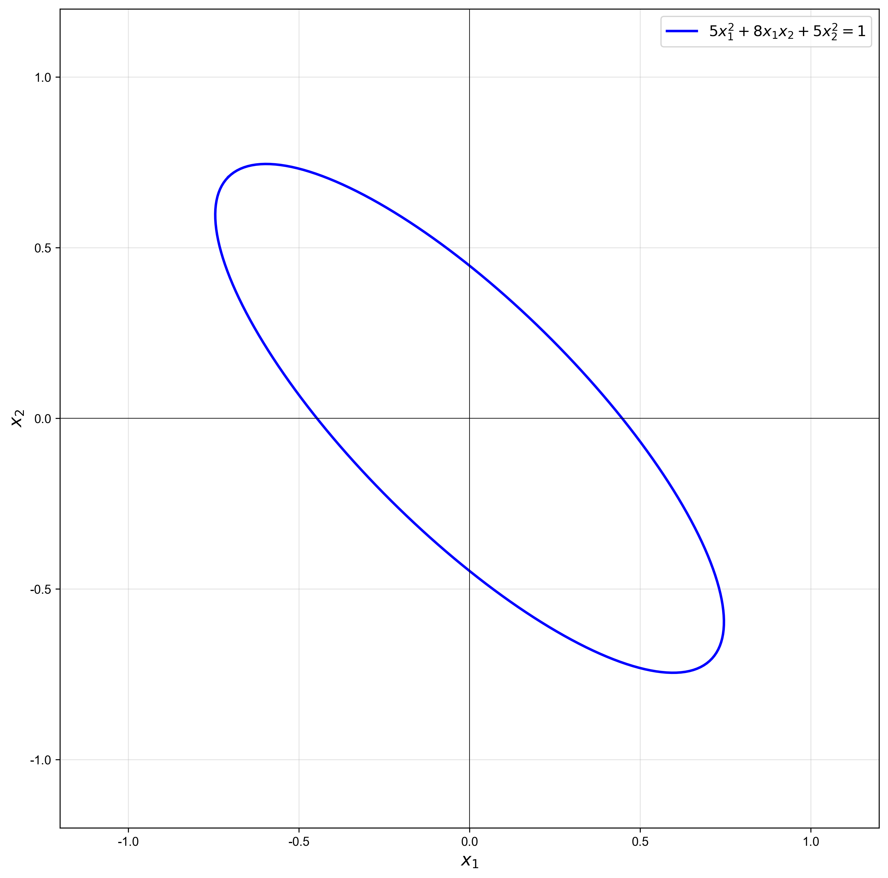 $$ \begin{align*} \mathbf{x}^T \mathbf{A} \mathbf{x} &= \begin{bmatrix} x_1 & x_2 \end{bmatrix} \begin{bmatrix} 5 & 4 \\ 4 & 5 \end{bmatrix} \begin{bmatrix} x_1 \\ x_2 \end{bmatrix} \\[6pt] &= \begin{bmatrix} x_1 & x_2 \end{bmatrix} \begin{bmatrix} 5x_1 + 4x_2 \\[6pt] 4x_1 + 5x_2 \end{bmatrix} \\[6pt] &= x_1(5x_1 + 4x_2) + x_2(4x_1 + 5x_2) \\[6pt] &= 5x_1^2 + 8x_1x_2 + 5x_2^2 = 1 \\[6pt] \end{align*} $$