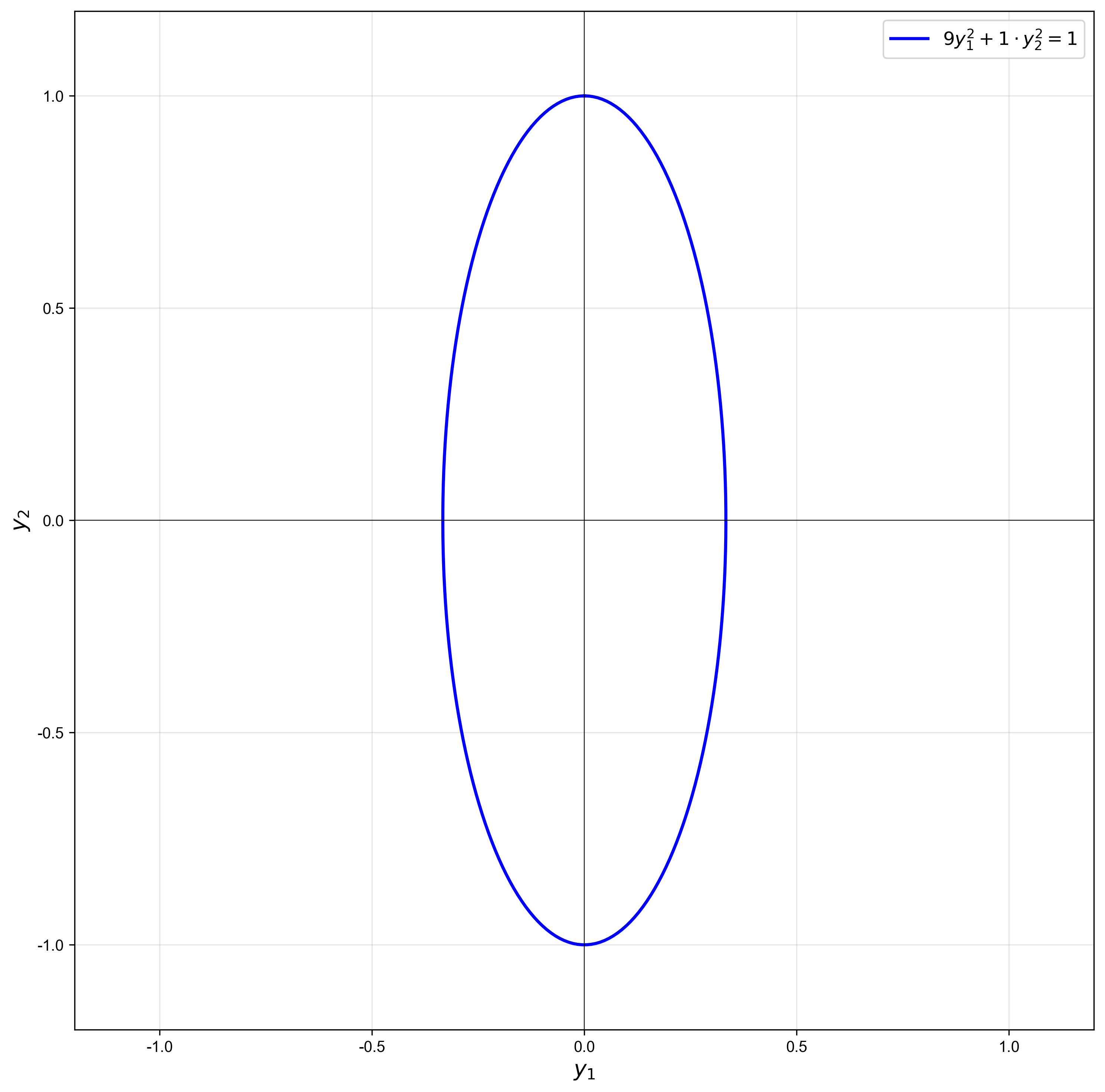 從上面的推導可以看出,原本複雜的二次型 $5x_1^2 + 8x_1x_2 + 5x_2^2 = 1$ 實際上只是標準形式 $9 y_1^2 + 1 \cdot y_2^2 = 1$ 經過座標轉換 $\mathbf{y} = \mathbf{Q}^T \mathbf{x}$ 後的結果。兩者描述的是同一個橢圓體,只是在不同座標系下的表示方式不同:在 $(x_1, x_2)$ 座標系中,橢圓的主軸是旋轉的;而在 $(y_1, y_2)$ 座標系中,橢圓的主軸與座標軸對齊