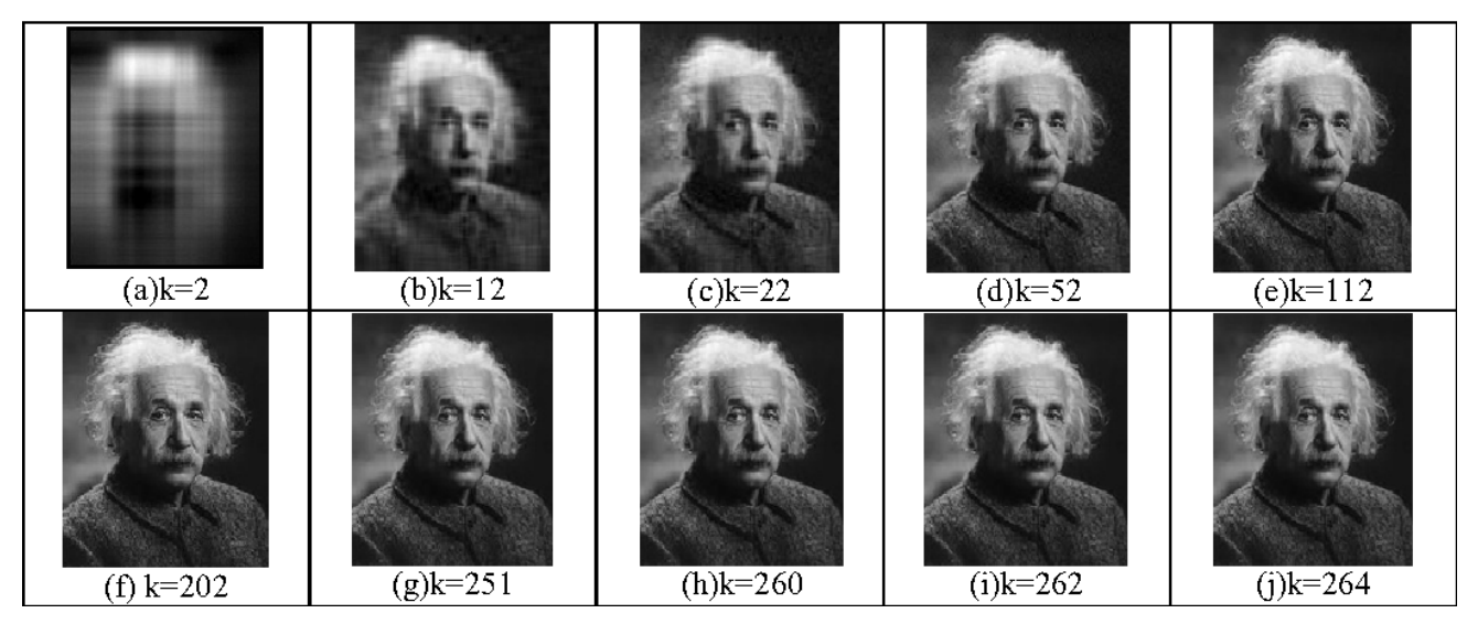 由上圖可以看出 $k=52$ 階近似產生出的圖片幾乎與完整的圖像 $k=264$ 沒有差別,但卻可以有效地將存儲空間大大減少
