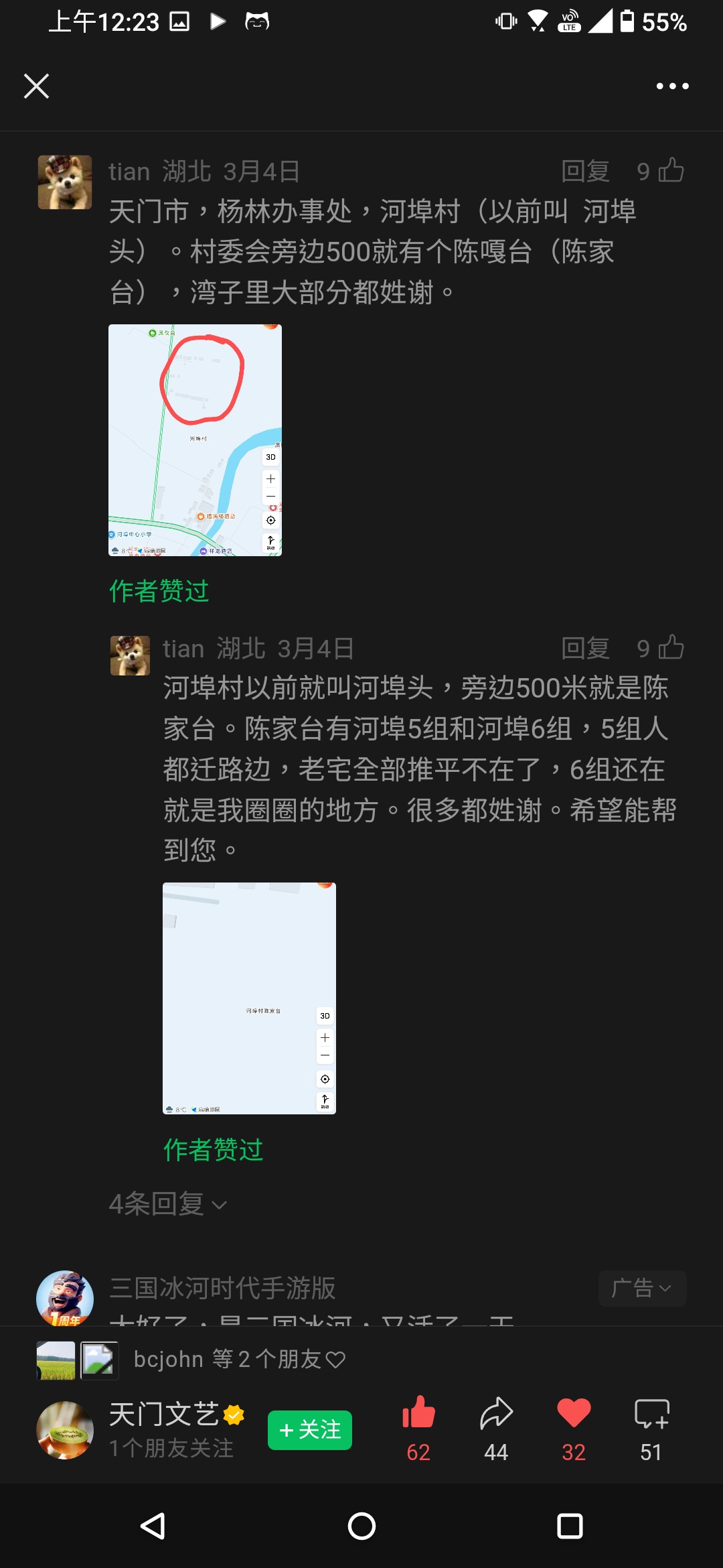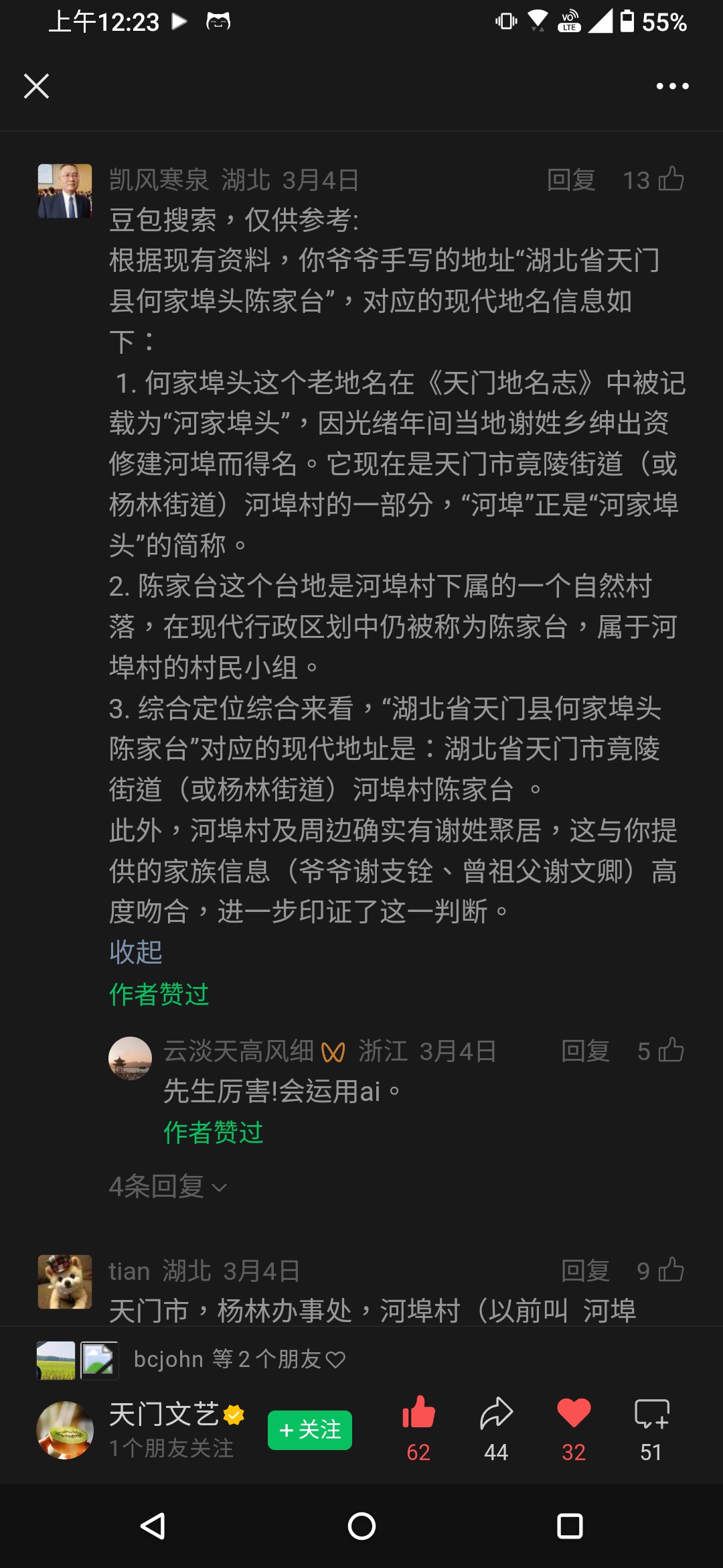 在出發前往大陸前,就有先把爺爺寫的舊地址:湖北省天門縣何家埠頭陳家台 問了豆包,他篤定地跟我說這個地址位在現今的堤灣村陳家台,由於我在 Gemini, ChatGPT 問了同樣的問題,都得不到現在地址的線索,而豆包這麼肯定的回覆我,讓我深信不疑的把這次的目標定在了堤灣村陳家台,打算到那邊再問問當地居民是否有謝家村落線索。