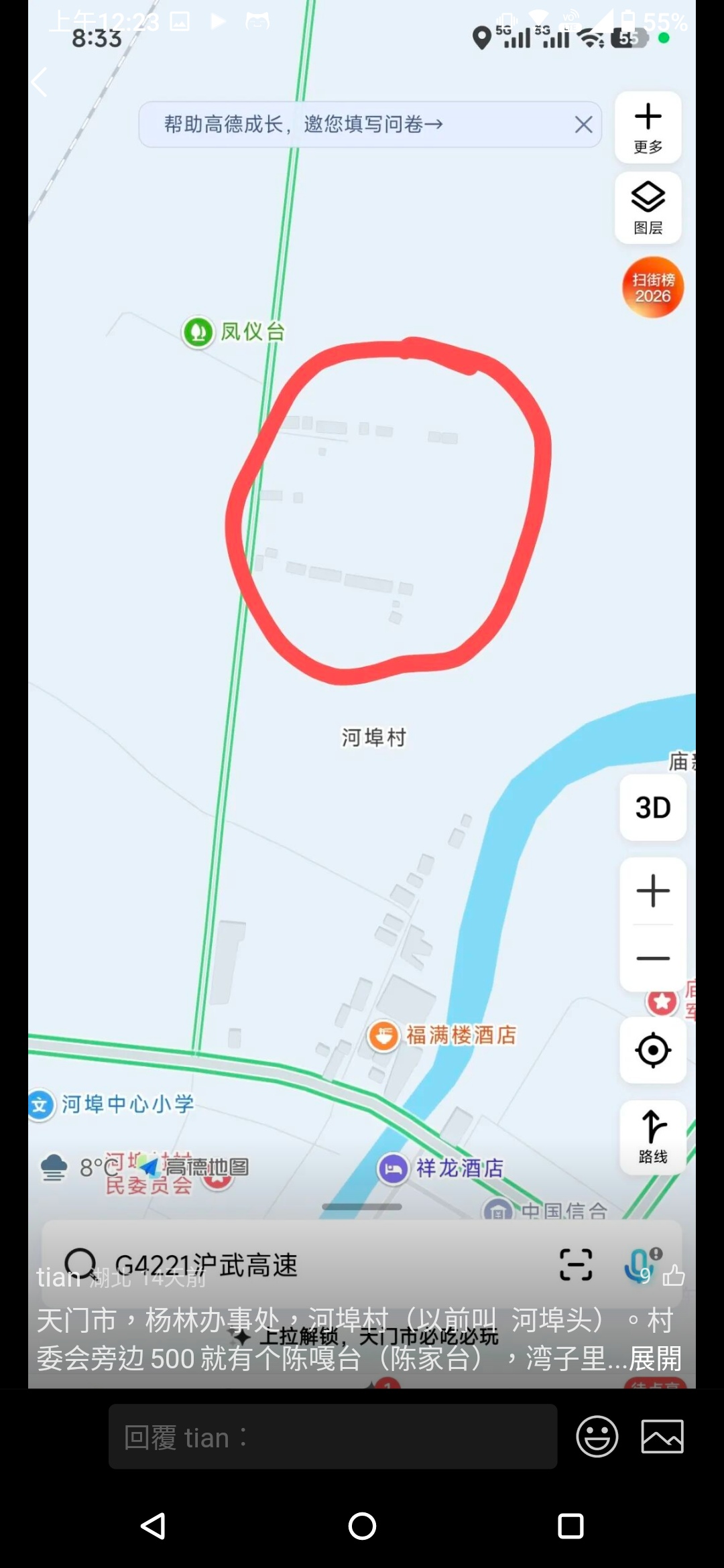 這文筆真是太神了!有一種古文的氣息,不愧是當地的散文作家,而且文章發出的第一天就有許多當地人提供線索了,原來舊址的何家埠頭陳家台是位在現今的楊林辦事處河埠村陳家台,底下留言有許多人表明當地村落都是姓謝的住家,看來就是這了!下次再訪~