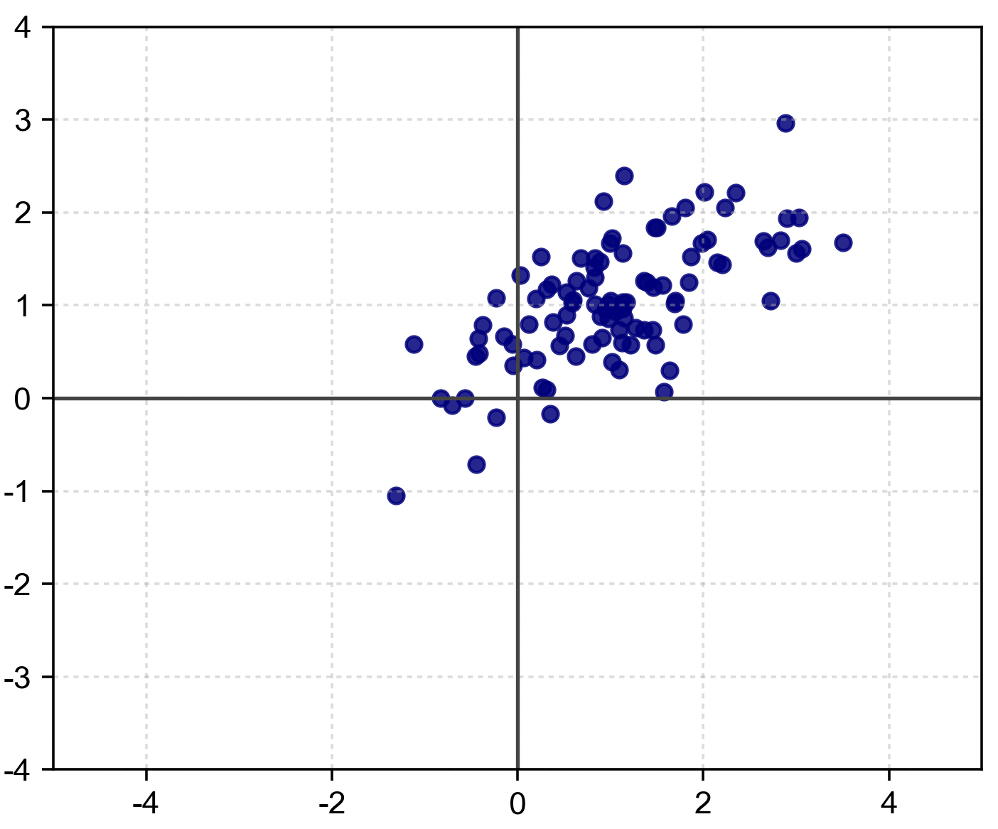 - 平移(向量 $\mathbf{b}$):將整個分佈的中心往右上方平移至座標 $(1, 1)$